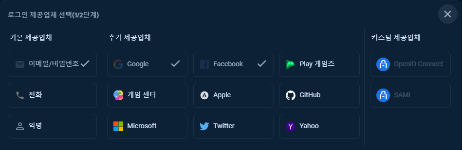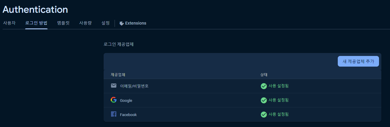 - Authentication 섹션에서 페이스북 로그인 방법 활성화