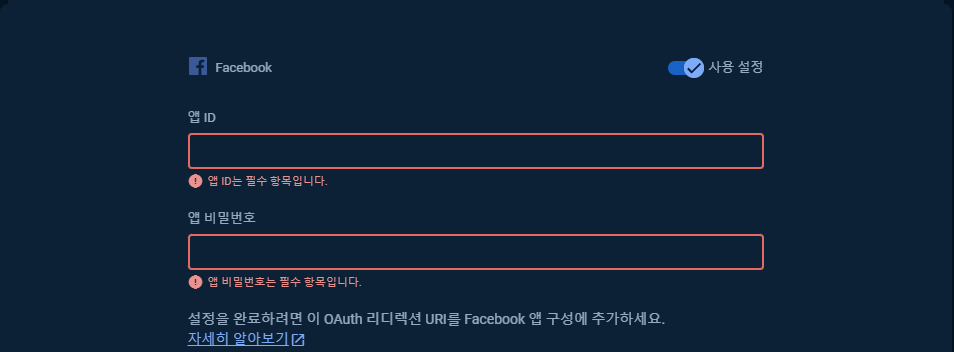 - 페이스북 앱 ID와 앱 시크릿 입력