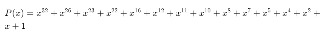 - 다항식 선택: CRC32는 다항식(Polynomial)을 사용하여 체크섬을 계산합니다. 이 다항식은 CRC 알고리즘의 핵심 요소로, 여러 다항식 중 하나가 선택됩니다. 예를 들어, CRC32의 다항식은 다음과 같습니다:이 다항식은 CRC32의 체크섬 계산 과정에서 각 비트에 대한 계수로 사용됩니다.