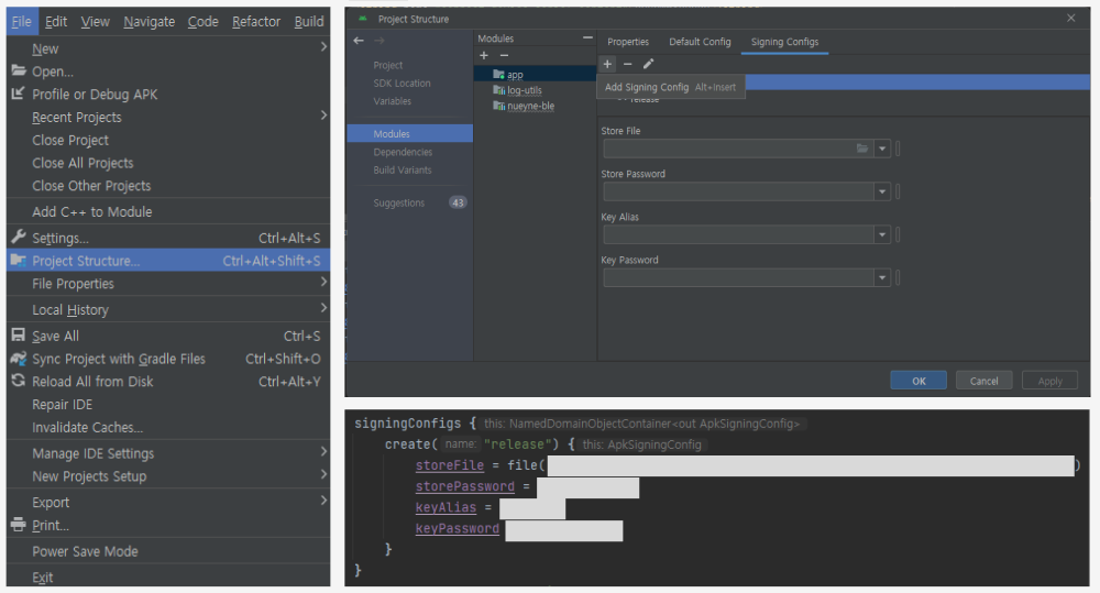 - 앱 모듈의 설정에서 Signing Configs를 선택