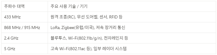 - 여러 기기가 동시에 같은 대역을 사용하기 때문에 간섭이 발생할 수 있고, 통신 품질이 떨어질 위험도 존재합니다.